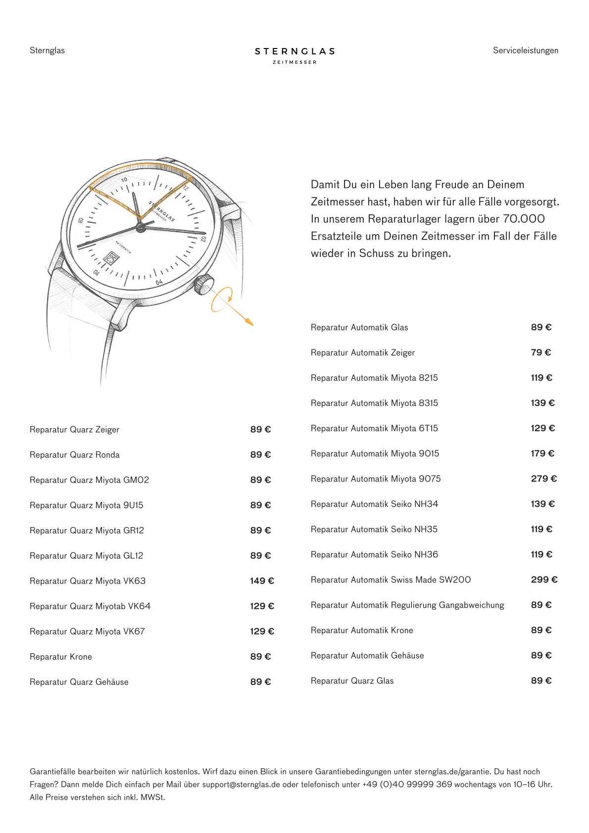 Solltest du Deine Uhr aber einmal zu uns einsenden müssen, obwohl die Garantie nicht mehr greift, findest du im Folgenden eine Aufstellung unserer Reparaturkosten: